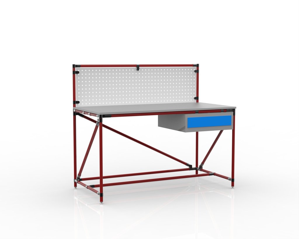 Werkbank mit Lochplatte aus dem Rohr-Baukastensystem. Der Tisch enthält eine beidseitig laminierte Spanplatte mit einer Dicke von 18 mm, einen Tischcontainer mit drei Schubladen, eine Lochplatte zur Aufhängung von Werkzeugen oder Kästen und vier verstellbare Füße. Tragfähigkeit bei gleichmäßiger Belastung von 100 kg. Abmessungen 1282 x 2000 x 750 mm.
