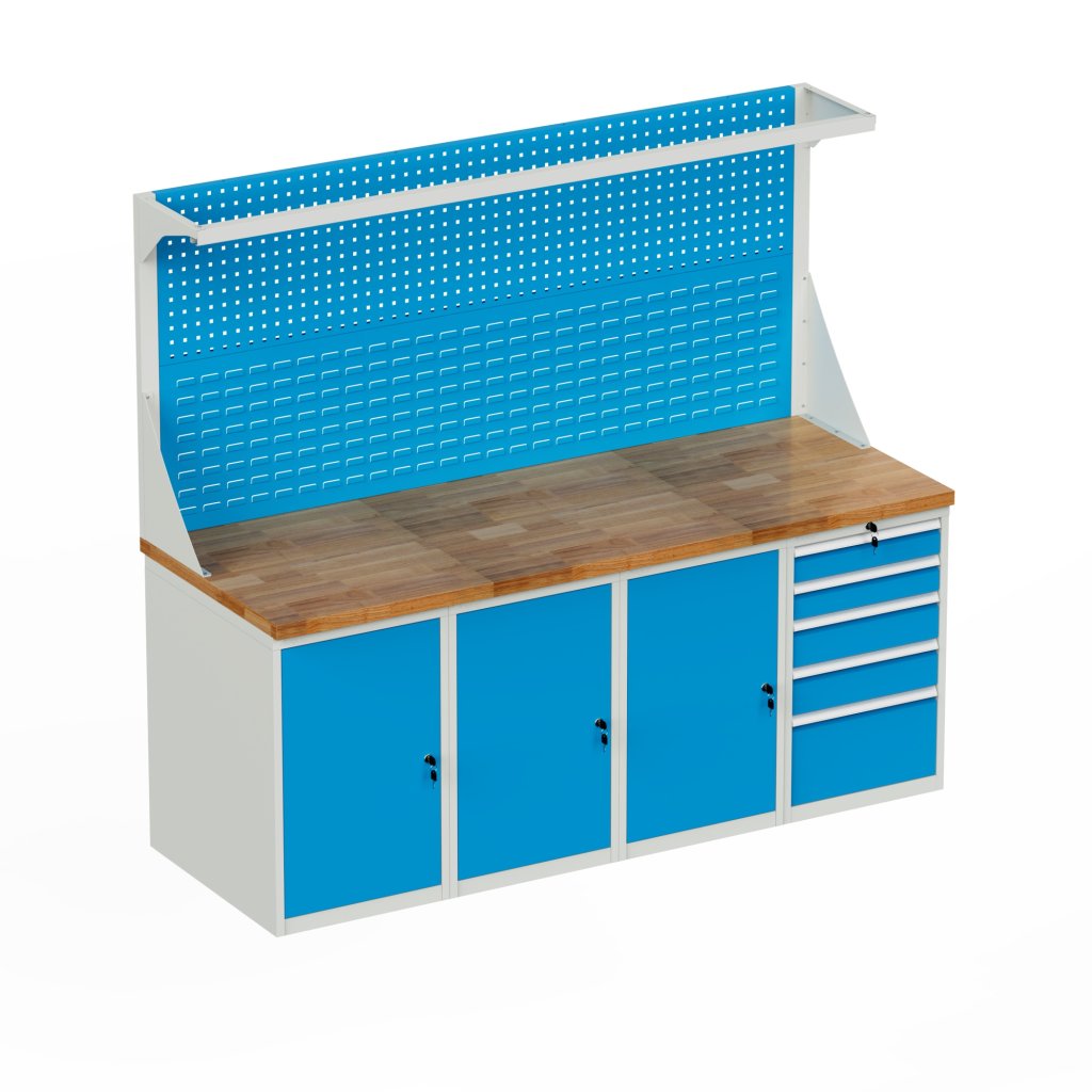 Arbeitsplatte aus 40 mm wasserfester Buchenholzverbindung. 4x Unterbaucontainer, Höhe 810, Breite 500, Tiefe 700 mm. Der Tisch hat eine Tragkraft von 500 kg, Höhe 850, Breite 2050, Tiefe 750 mm, Containerfarbe Grau RAL 7035/Blau RAL 5012.