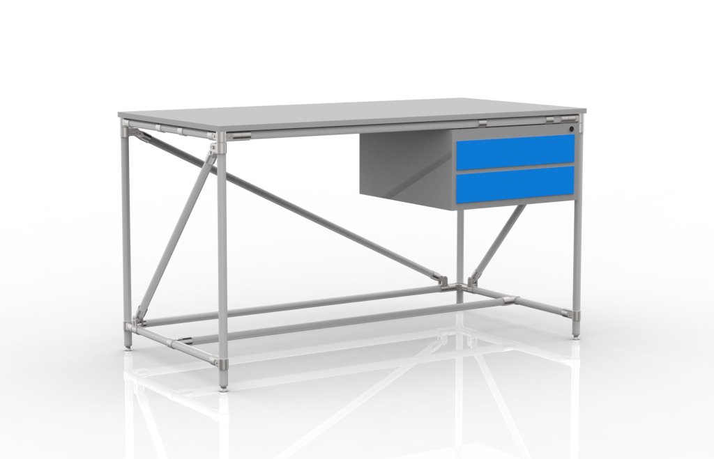 Werkbank aus einem Rohrbausatzsystem mit einer Arbeitsplatte aus laminiertem Holz, 18 mm dick, einem Tischcontainer mit zwei Schubladen und vier verstellbaren Füßen. Tragfähigkeit bei gleichmäßiger Lastverteilung 100 kg. Maße 850 x 1500 x 750 mm.