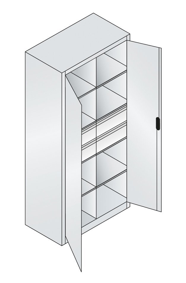 Werkstattschrank, 2 Türen, B x H x T 950 x 1950 x 600 mm, 2 Fachböden, 4 Schubladen, verglaste Türen oder Drahtgittertüren liferbar. Korpusfarben RAL 7035 Lichtgrau.