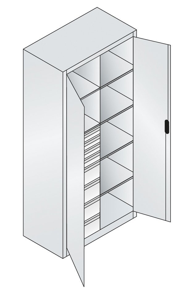 Werkstattschrank, 2 Türen, B x H x T 950 x 1950 x 600 mm, 2 Fachböden, 4 Schubladen, verglaste Türen oder Drahtgittertüren liferbar. Korpusfarben RAL 7035 Lichtgrau.