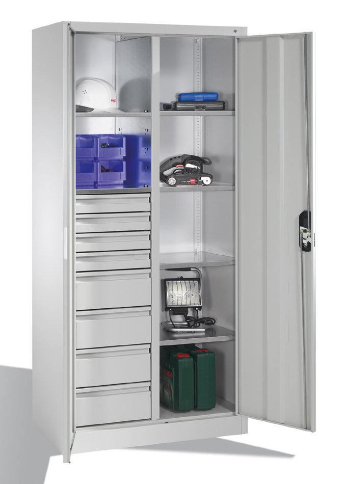 Werkstattschrank, 2 Türen, B x H x T 950 x 1950 x 600 mm, 1 Fachboden, 8 Schubladen, verglaste Türen oder Drahtgittertüren lieferbar. Korpusfarben RAL 7035 Lichtgrau.