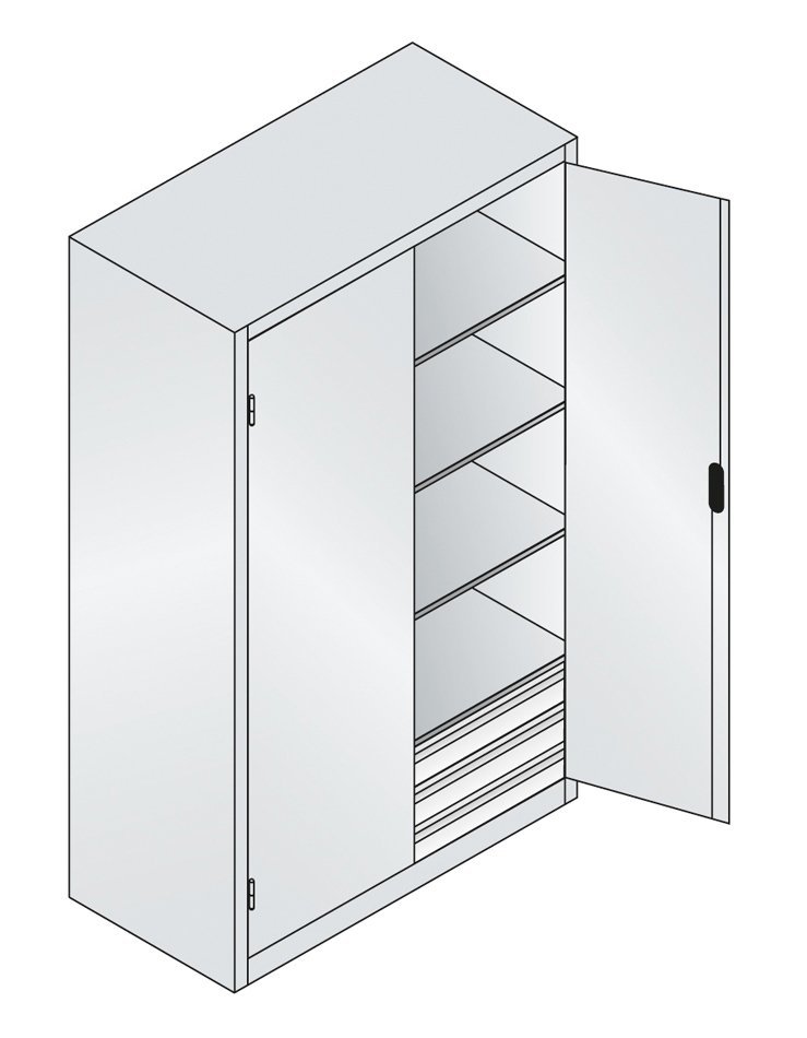 Werkstattschrank, 2 Türen, B x H x T 950 x 1950 x 600 mm, 2 Fachböden, 2 Schubladen, verglaste Türen oder Drahtgittertüren lieferbar. Korpusfarben RAL 7035 Lichtgrau.