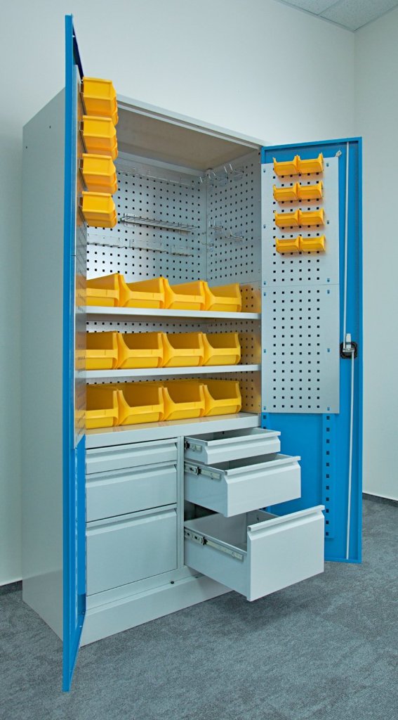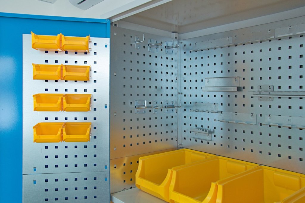 Werkstattschrank Kovona S44204, H x B x T 1950 x 950 x 500 mm, mit Lochplatten, Sichtlagerkästen und Werkzeughalterungen vollständige Beschreibung und Parameter