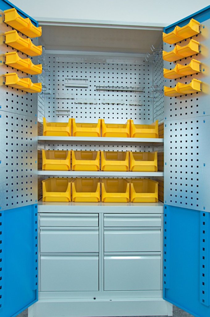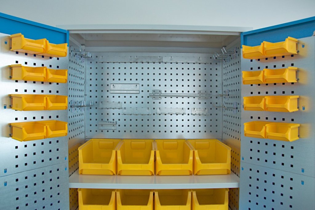 Werkstattschrank Kovona S44204, H x B x T 1950 x 950 x 500 mm, mit Lochplatten, Sichtlagerkästen und Werkzeughalterungen
