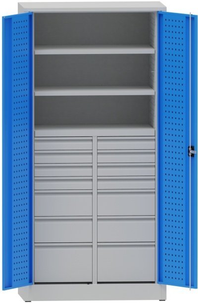 Werkstattschrank S44400, H x B x T 1950 x 950 x 500 mm. 3-Punkt-Verriegelung, 14x Schublade, 2x Fachboden. Korpusfarbe RAL 7035 Lichtgrau, Türenfarbe RAL 7035 Lichtgrau oder RAL 5012 Lichtblau.