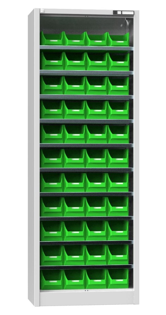 Werkstattschrank mit Sichtlagerkästen, H x B x T 1950 x 700 x 400 mm. Die Kunststoffboxen sind in Farben blau, rot, gelb, grün oder grau erhältlich, ausgewählte Farben bitte in Bemerkung schreiben.