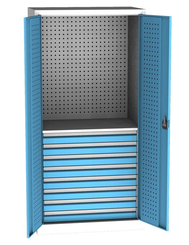 Werkstattschrank, 2 Türen, B x H x T 950 x 1950 x 600 mm, 1 Fachboden, 8 Schubladen, verglaste Türen oder Drahtgittertüren lieferbar. Korpusfarben RAL 7035 Lichtgrau.