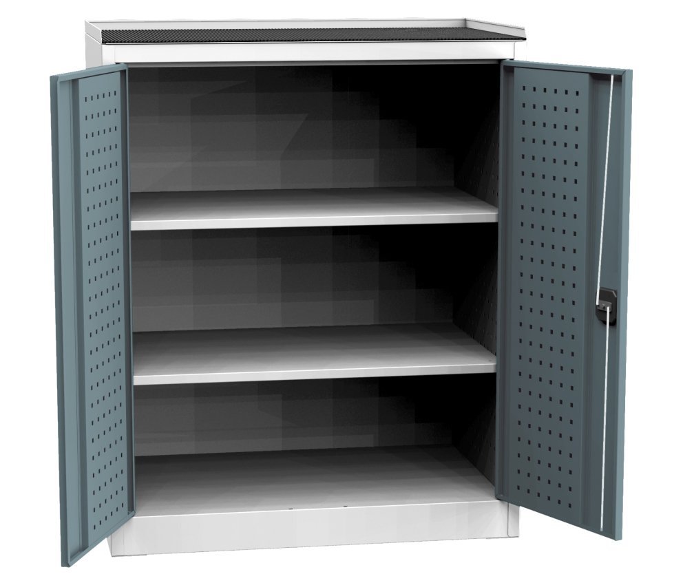 Werkstattschrank, 2 Türen, B x H x T 950 x 1180 x 600 mm, 2 Fachböden, verglaste Türen oder Drahtgittertüren lieferbar. Korpusfarben RAL 7035 Lichtgrau.