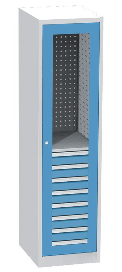 Werkstattschrank mit verglasten Türen, B x H x T 505 x 1950 x 600 mm. Korpusfarben RAL 7035 Lichtgrau.