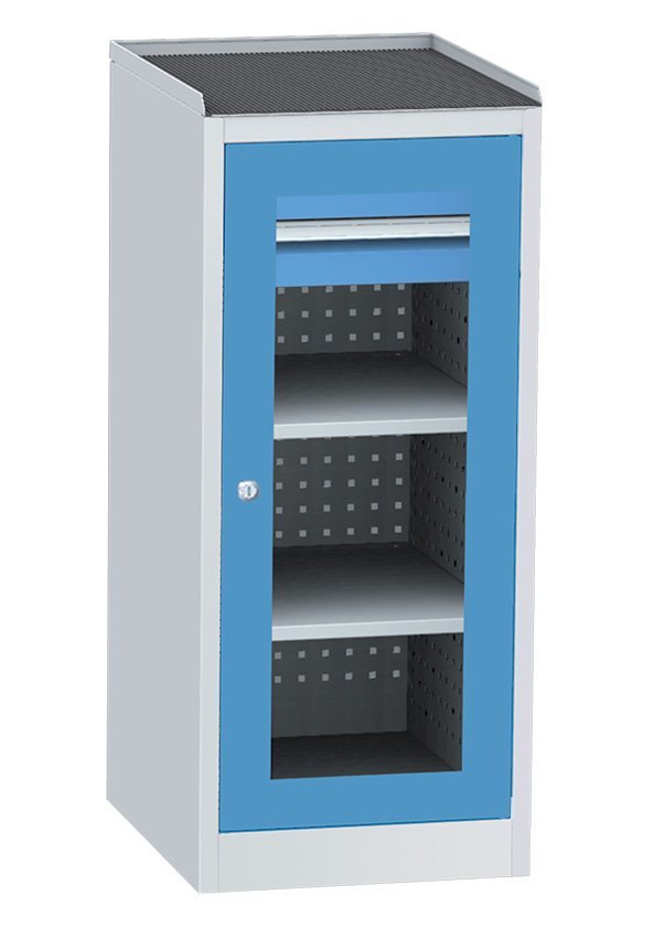 Werkstattschrank mit verglasten Türen, B x H x T 505 x 1180 x 600 mm, 2 Fachböden, 2 Schubladen. Korpusfarben RAL 7035 Lichtgrau. vollständige Beschreibung und Parameter