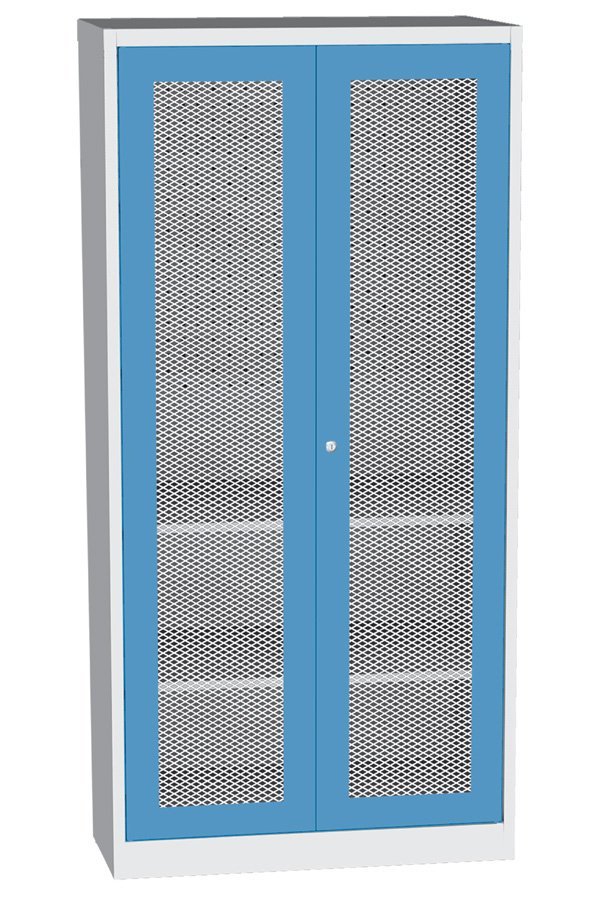 Werkstattschrank mit Drahtgittertüren, B x H x T 950 x 1950 x 600 mm, 2 Fachböden. Korpusfarben RAL 7035 Lichtgrau. vollständige Beschreibung und Parameter