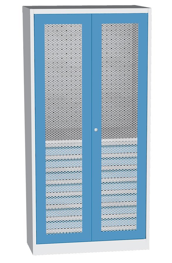 Werkstattschrank mit Drahtgittertüren, B x H x T 950 x 1950 x 600 mm, 1 Fachboden, 8 Schubladen. Korpusfarben RAL 7035 Lichtgrau vollständige Beschreibung und Parameter