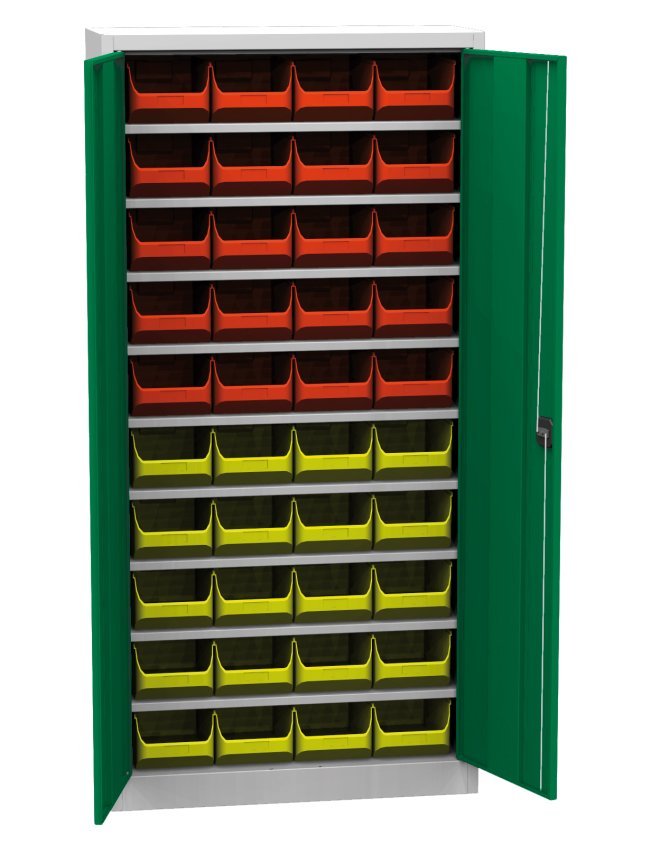Werkstattschrank, 2 Türen, B x H x T 750 x 1650 x 300 mm, 11 Fachböden, 36 Behälter aus Kunststoff Small (B x H x T 110 x 75 x 165 mm), 24 Behälter Medium (155 x 125 x 240 mm). Verglaste Türen oder Drahtgittertüren lieferbar.