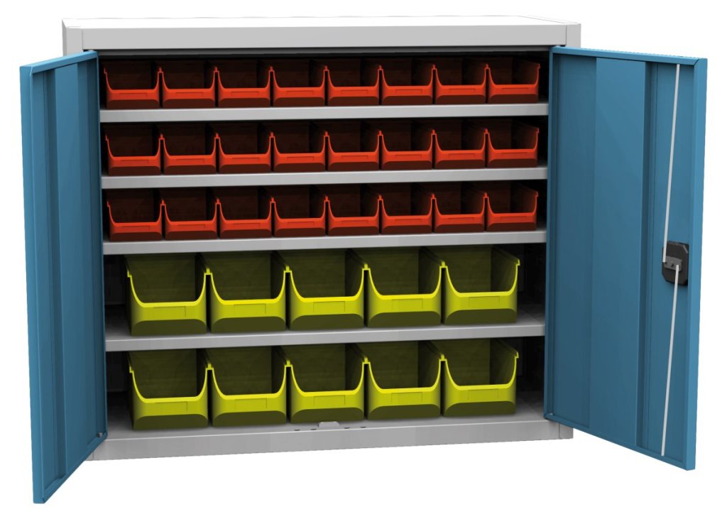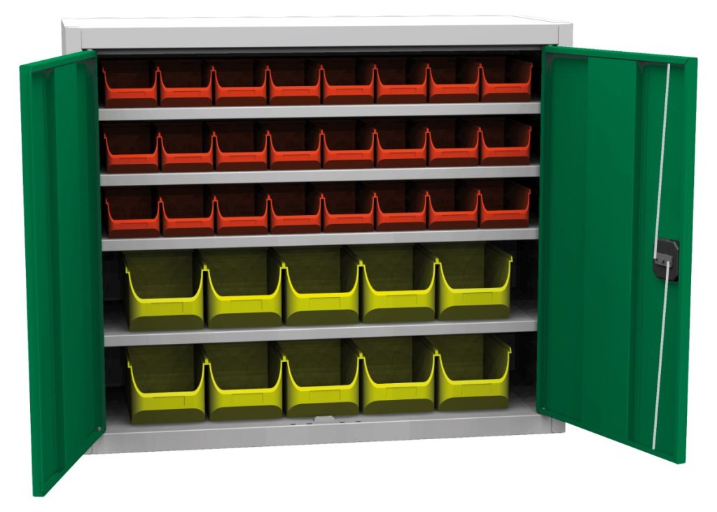 Werkstattschrank, 2 Türen, B x H x T 750 x 800 x 300 mm, 5 Fachböden, 24 Behälter aus Kunststoff 456201 (B x H x T 102 x 60 x 100 mm), 8 Behälter 456210 (150 x 125 x 235 mm), verglaste Türen oder Drahtgittertüren lieferbar.
