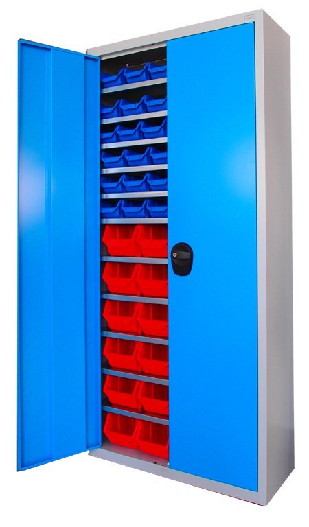 Werkstattschrank, 2 Türen, B x H x T 950 x 1950 x 400 mm, 9 Fachböden, 20 Behälter aus Kunststoff 456213 (B x H x T 205 x 150 x 355 mm), 20 Behälter aus Kunststoff 456214 (B x H x T 205 x 150 x 355 mm), verglaste Türen oder Drahtgittertüren lieferbar.