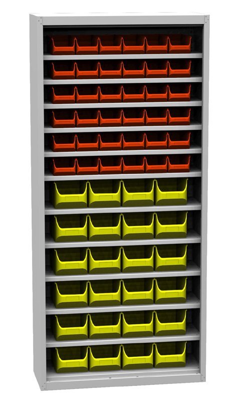 Werkstattschrank, Variante ohne Türen, B x H x T 750 x 1650 x 300 mm, 11 Fachböden, 36 Behälter aus Kunststoff Small (110 x 75 x 165 mm), 24 Behälter Medium (155 x 125 x 240 mm).