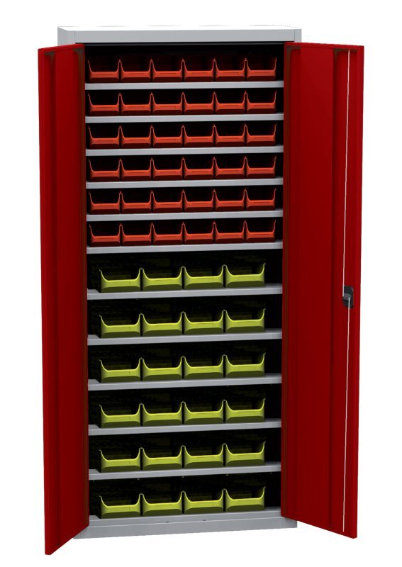 Werkstattschrank, 2 Türen, B x H x T 750 x 800 x 300 mm, 5 Fachböden, 24 Behälter aus Kunststoff 456201 (B x H x T 102 x 60 x 100 mm), 8 Behälter 456210 (150 x 125 x 235 mm), verglaste Türen oder Drahtgittertüren lieferbar.
