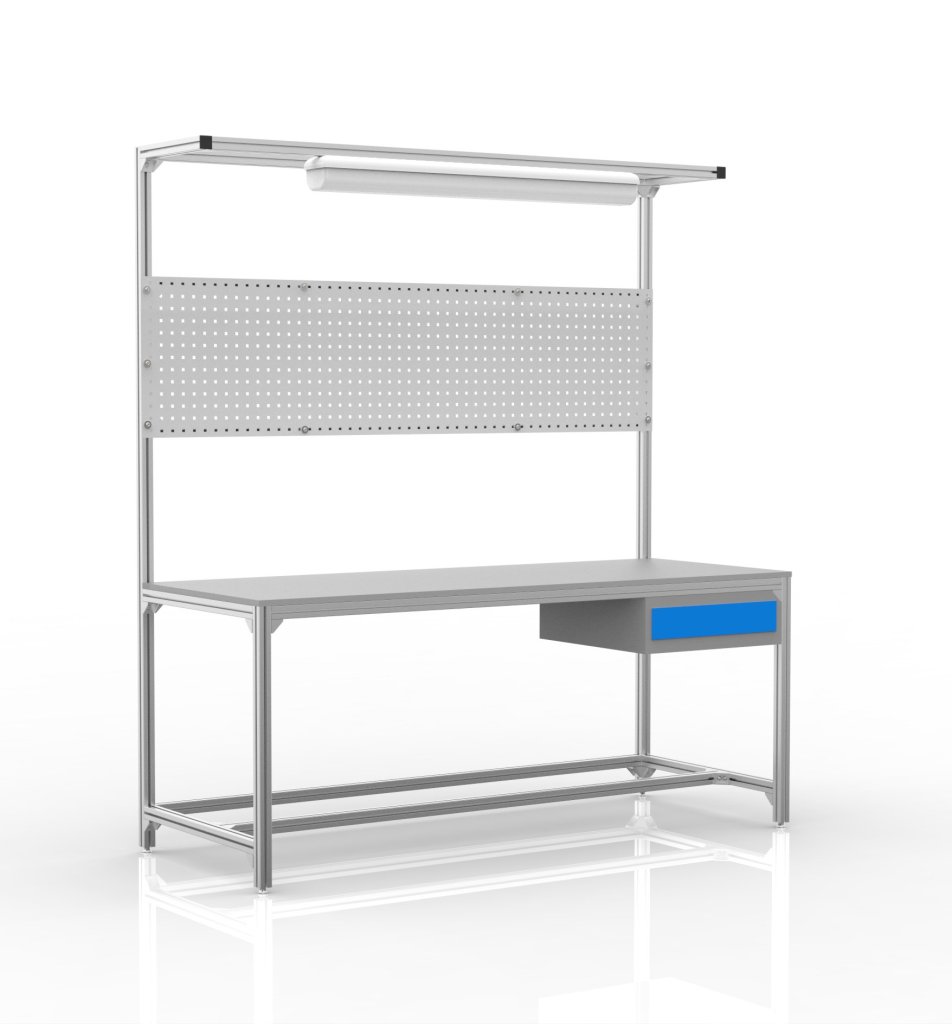 Werkstatttisch aus Aluminiumprofilen. Der Tisch umfasst eine Laminatplatte, einen Tischbehälter, eine Lochplatte zum Aufhängen von Kisten oder Werkzeugen, LED-Beleuchtung und höhenverstellbare Beine. Dank der Verwendung von Aluminiumprofilen ist der Tisch leicht und gleichzeitig sehr stabil. Belastbarkeit bei einer gleichmäßigen Belastung von 500 kg. Abmessungen 2200 x 1200 x 790 mm.