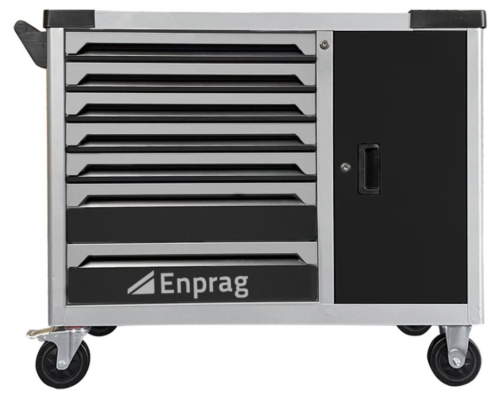 Werkstatt-Servicewagen - 7x Schublade. Höhe 951 x Breite 954 x Tiefe 459 mm. 2 Lenkrollen und 2 Bockrollen, mit Handgriff. Farbe grau RAL 7040 / schwarz RAL 9017.