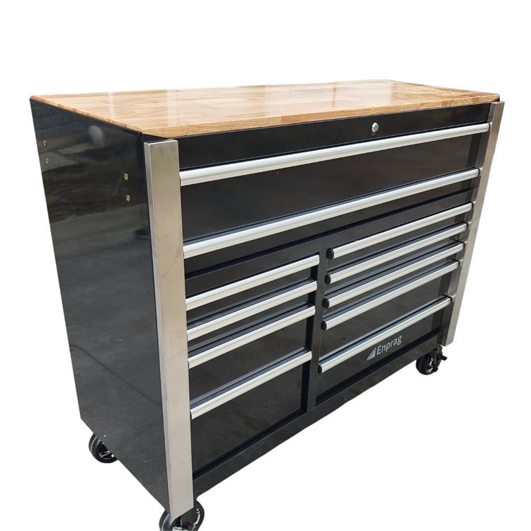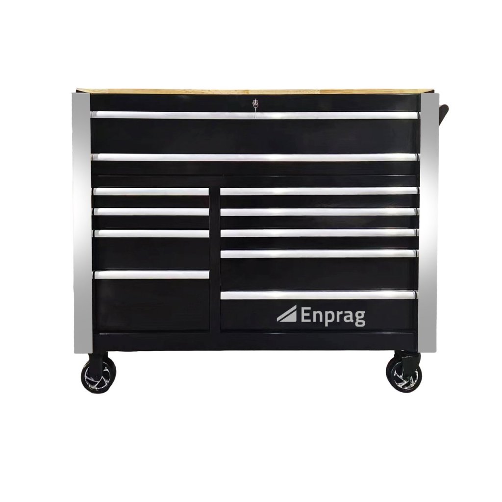 Werkstatt-Servicewagen - 11x Schublade. Höhe 1105 x Breite 1350 x Tiefe 520 mm. 2 Lenkrollen und 2 Bockrollen, mit Handgriff. Farbe schwarz RAL 9017.